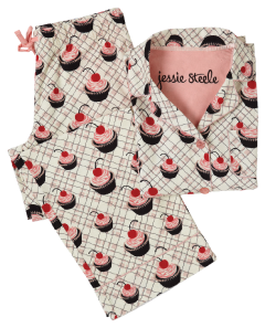 Jessie Steele Cupcake Boyfriend Two-Piece Pajama Set #1059 Satisfy your sweet tooth with these Cherry Cupcake print pajama set. Constructed of 100% plush cotton flannel. Pajamas come folded with a matching headband. Low rise with drawstring waistband. Wide leg flattering fit. Sizes: S (2-4) M (6-8) L (10-12) XL 14 $59.95 |