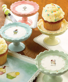 Pedestal Cupcake Plate Collection #1605 You will fall in love with these hand-painted cupcake artwork in sweet candy colors. Scalloped border with embossed dots, and cupcake image in the middle. You will receive one of each color - green, yellow, pink, and blue with the words delish, bliss, sweet, and yum. Ceramic. Hand wash. Great presentation for serving your cupcakes individually. Dimensions: 2.75" diameter by 4.25" high $39.95 |